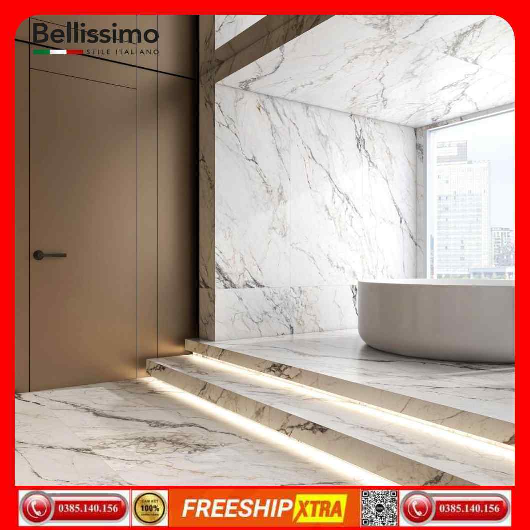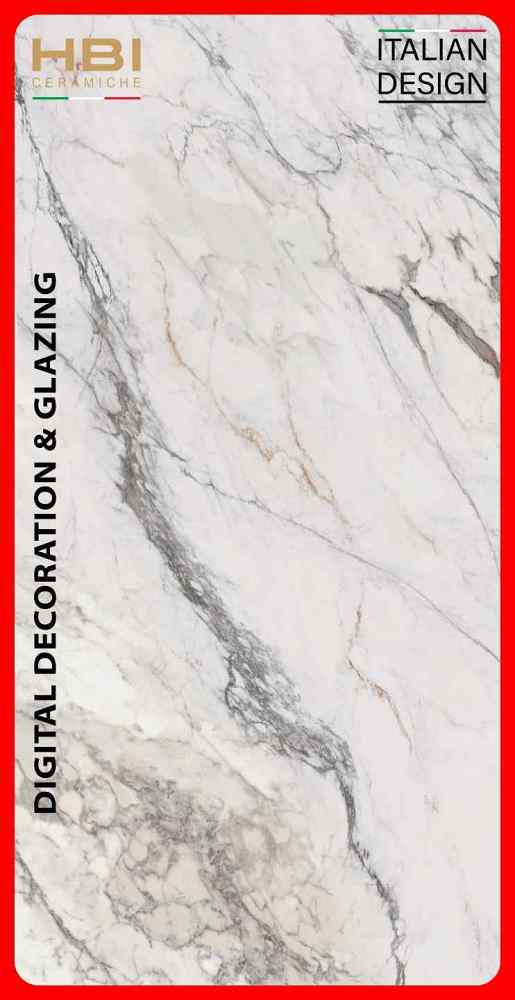 Gạch Italy 100×200 HBI-HB10201 đá marbal màu trắng vân xám Calacata